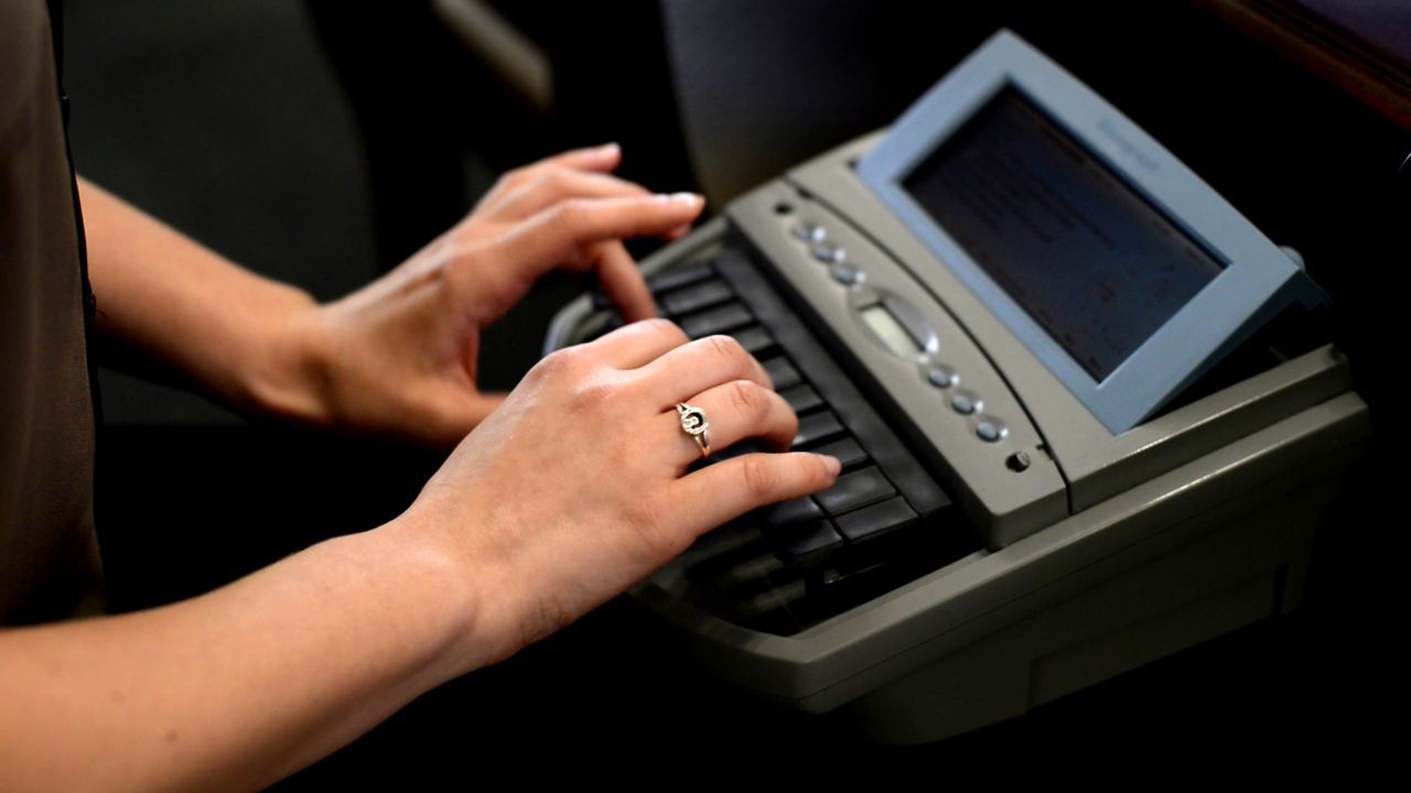 play the keys on a steno machine so as to produce stenographic marks. The keys are pressed using both hands. Each downward motion of the hands is a stroke